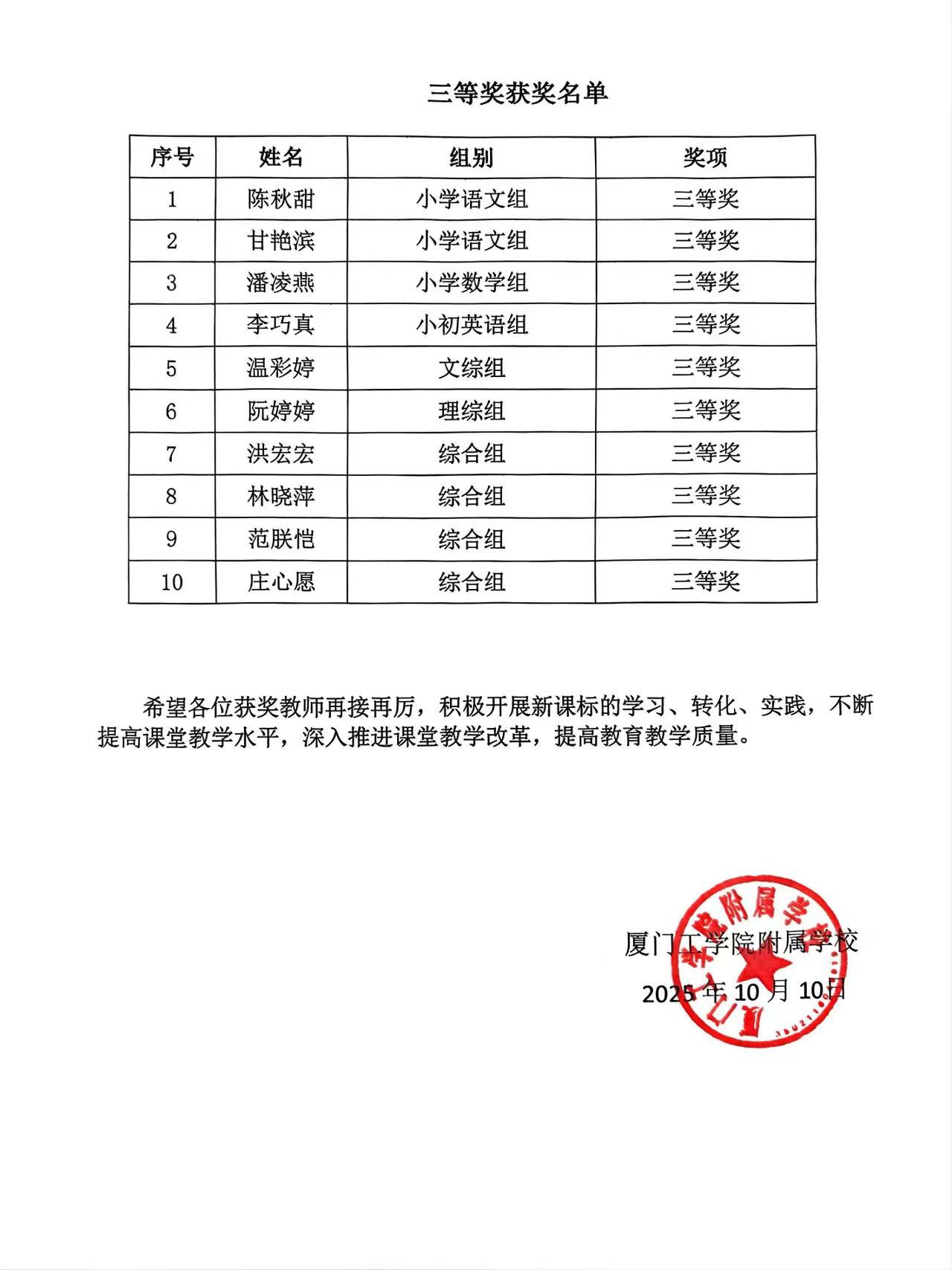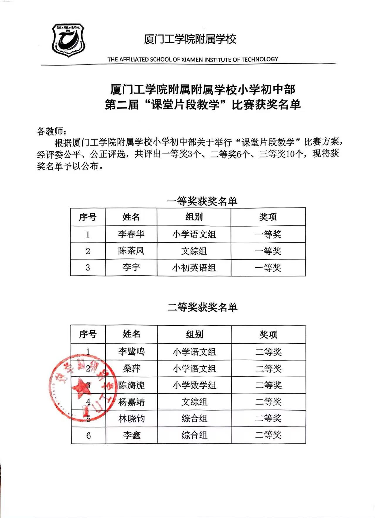 厦门工学院附属附属学校小学初中部 第二届“课堂片段教学”比赛获奖名单