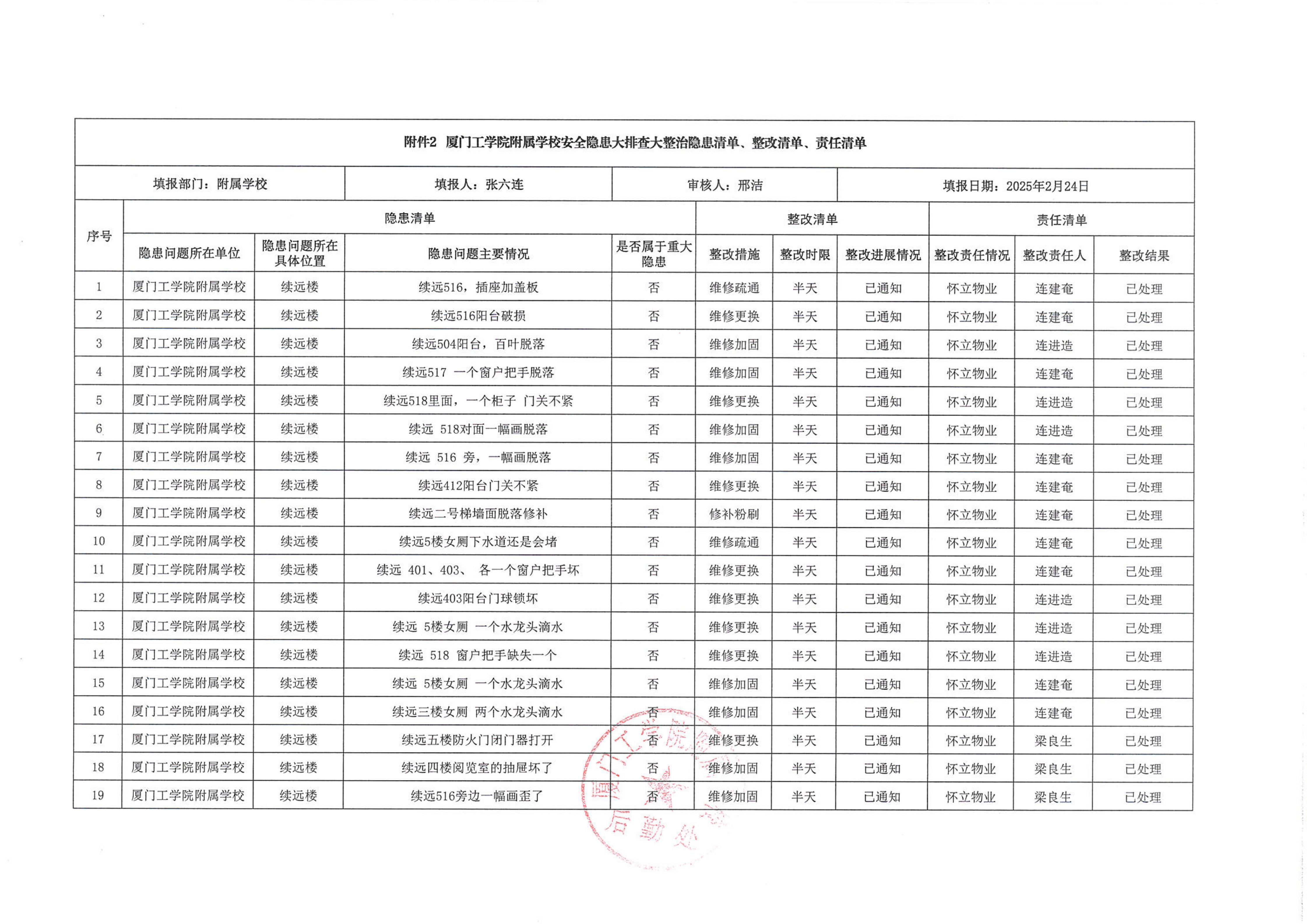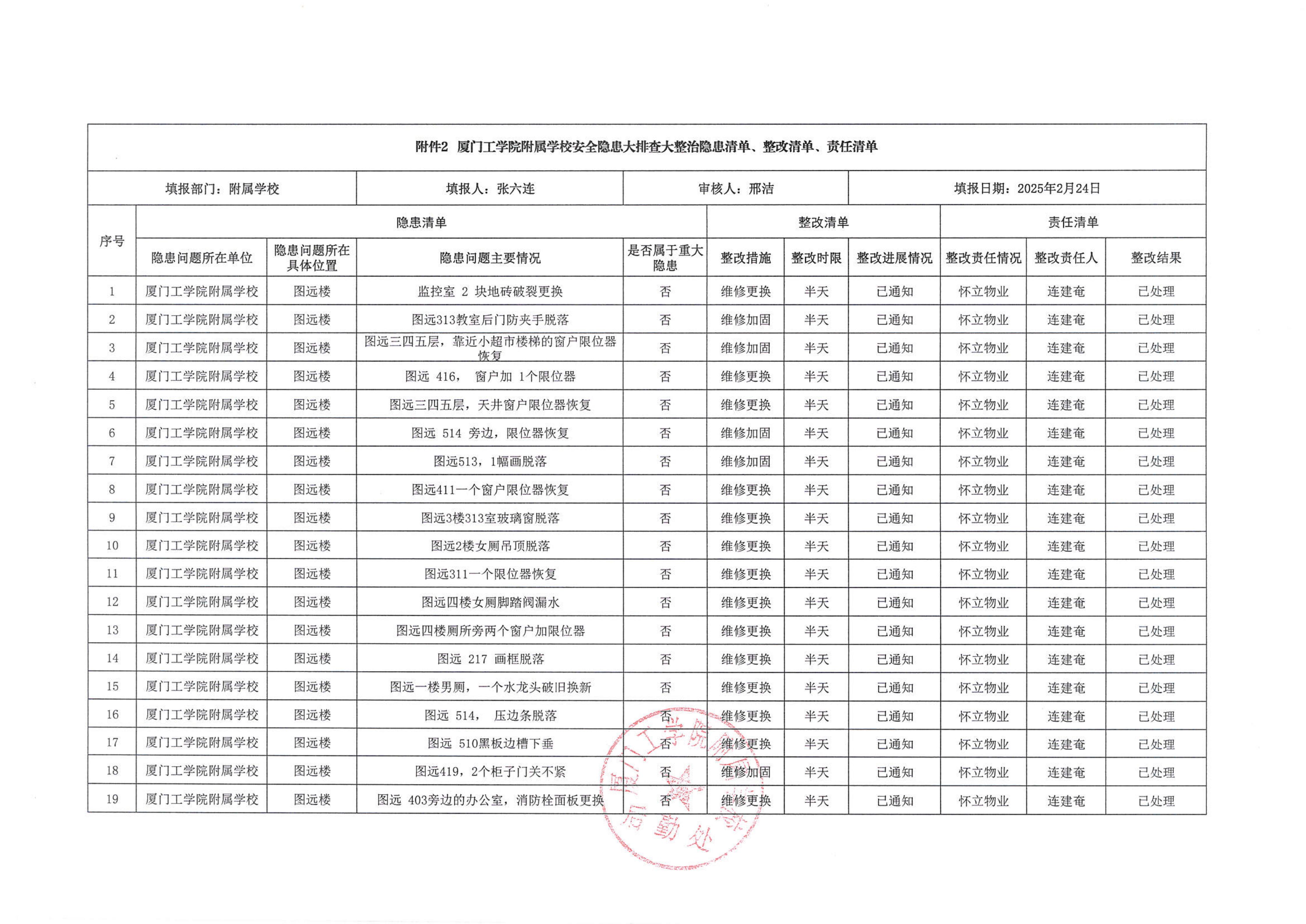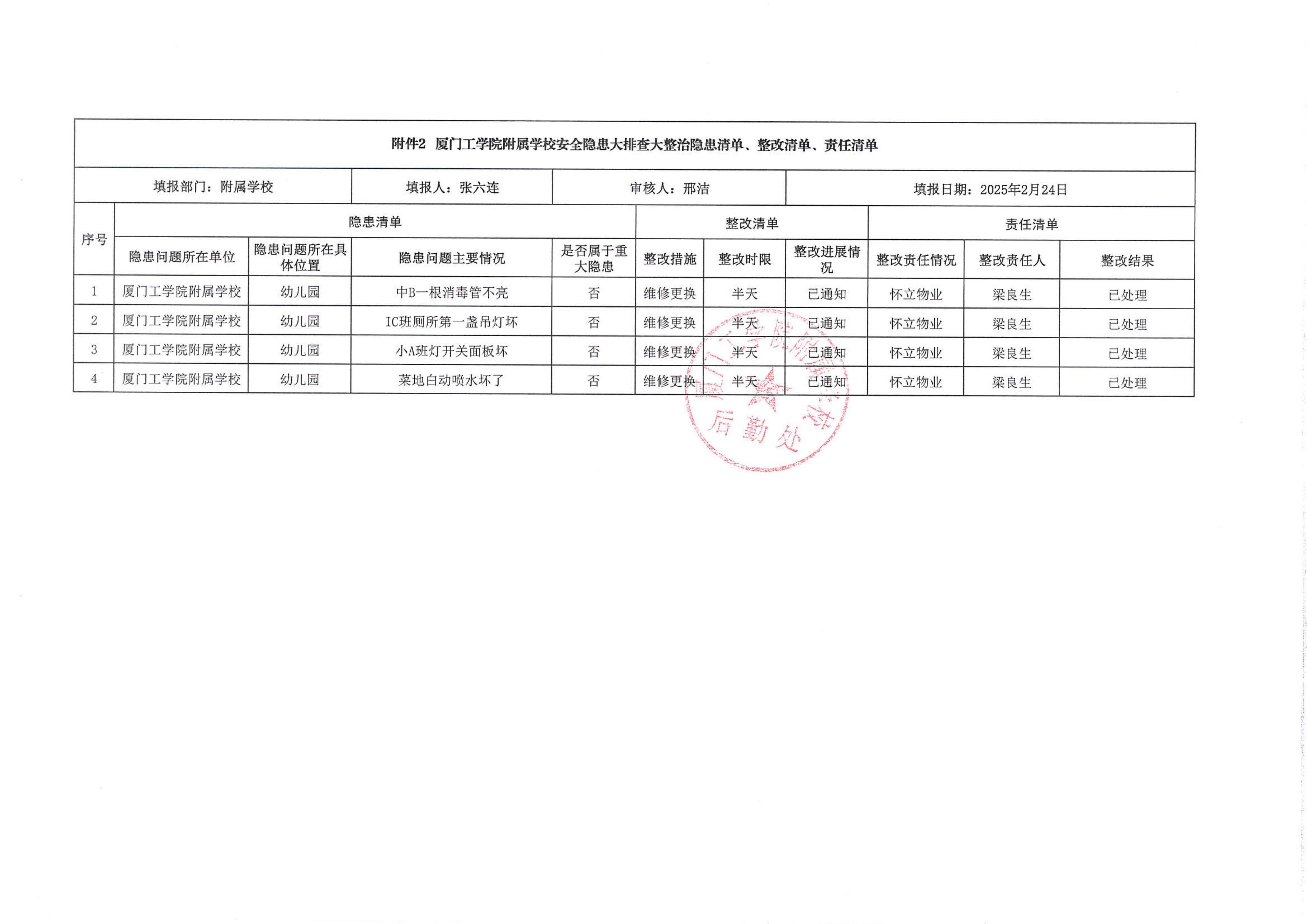 厦门工学院附属学校2025年2月份安全隐患大排查大整治隐患清单、整改清单、责任清单