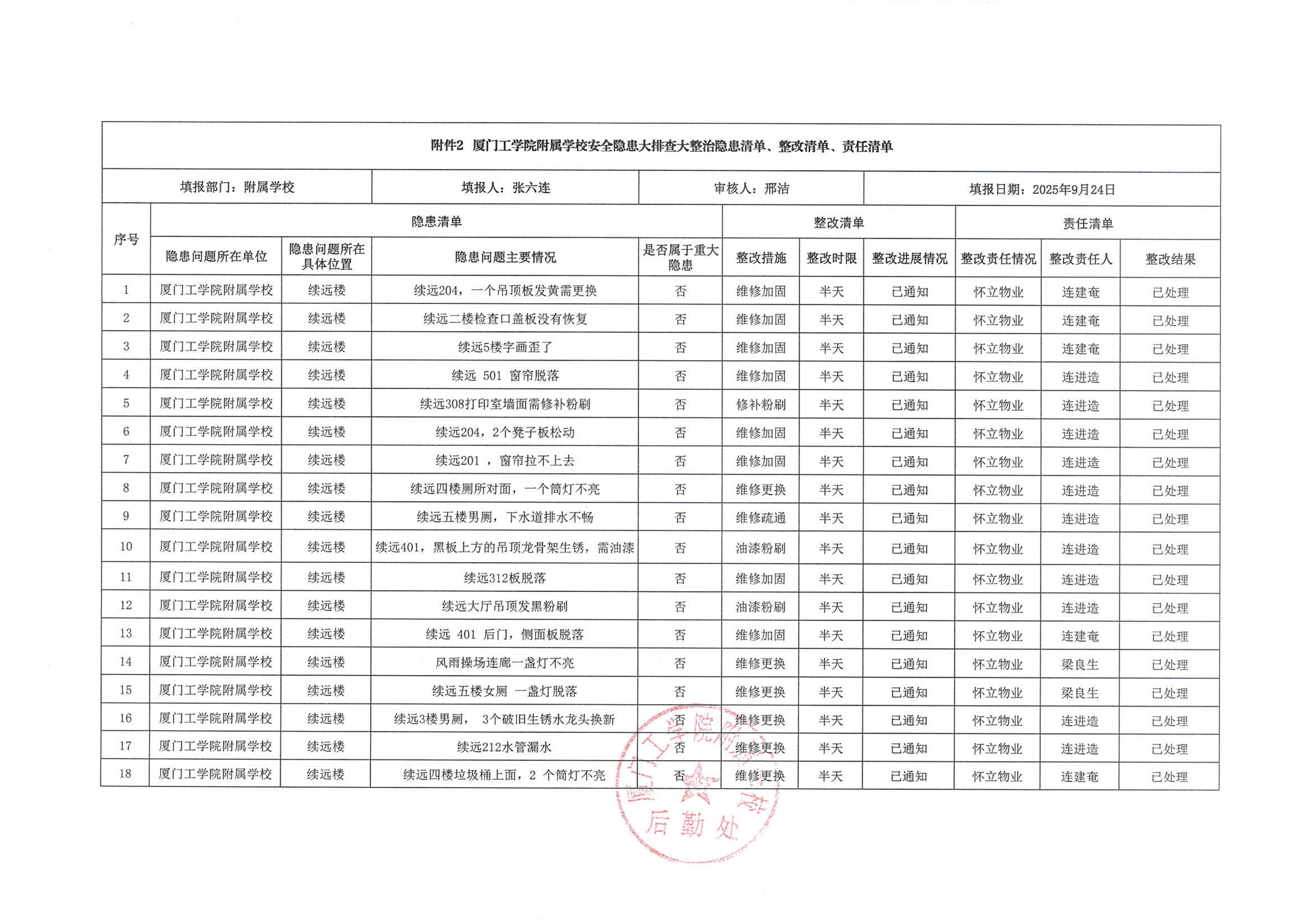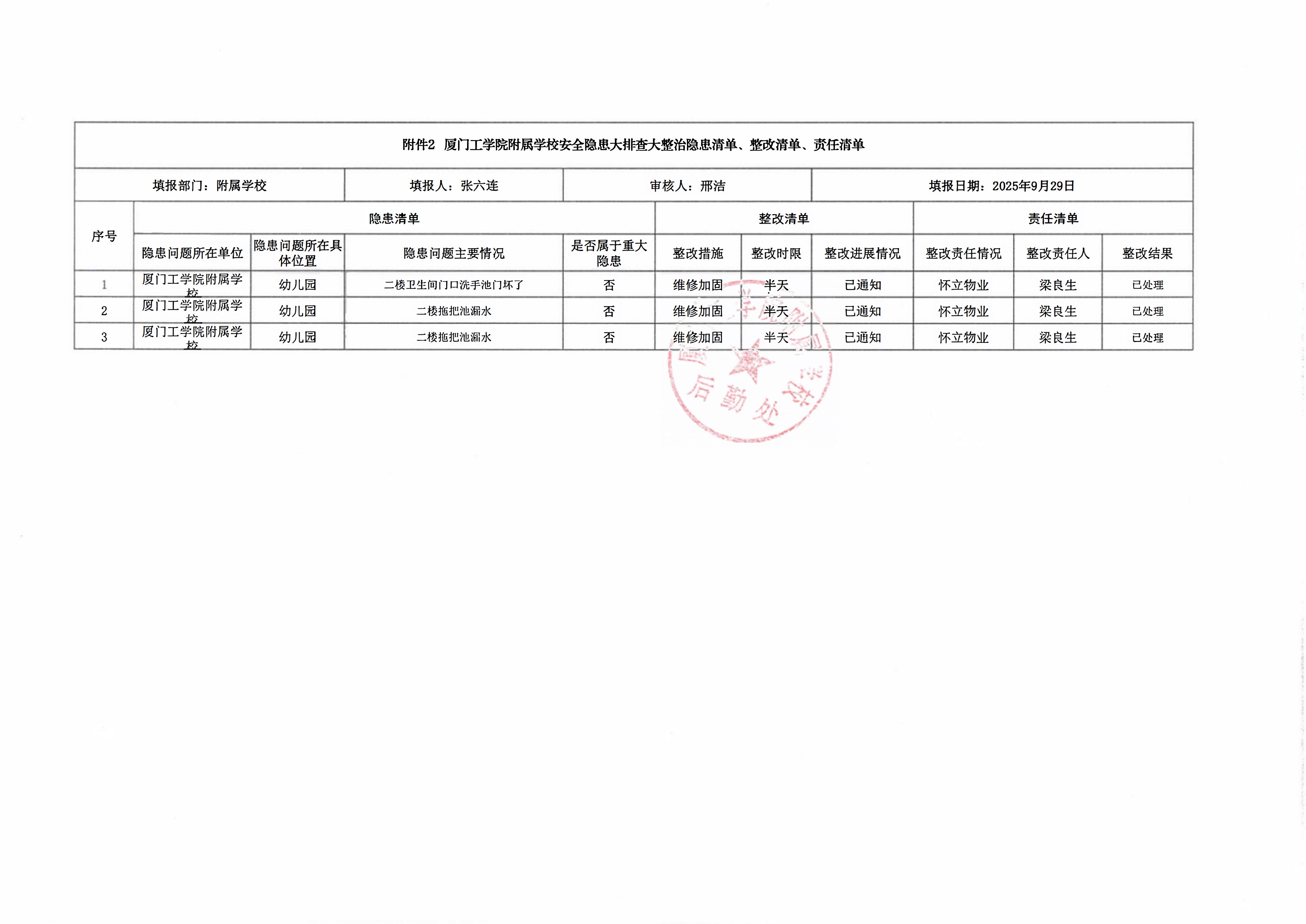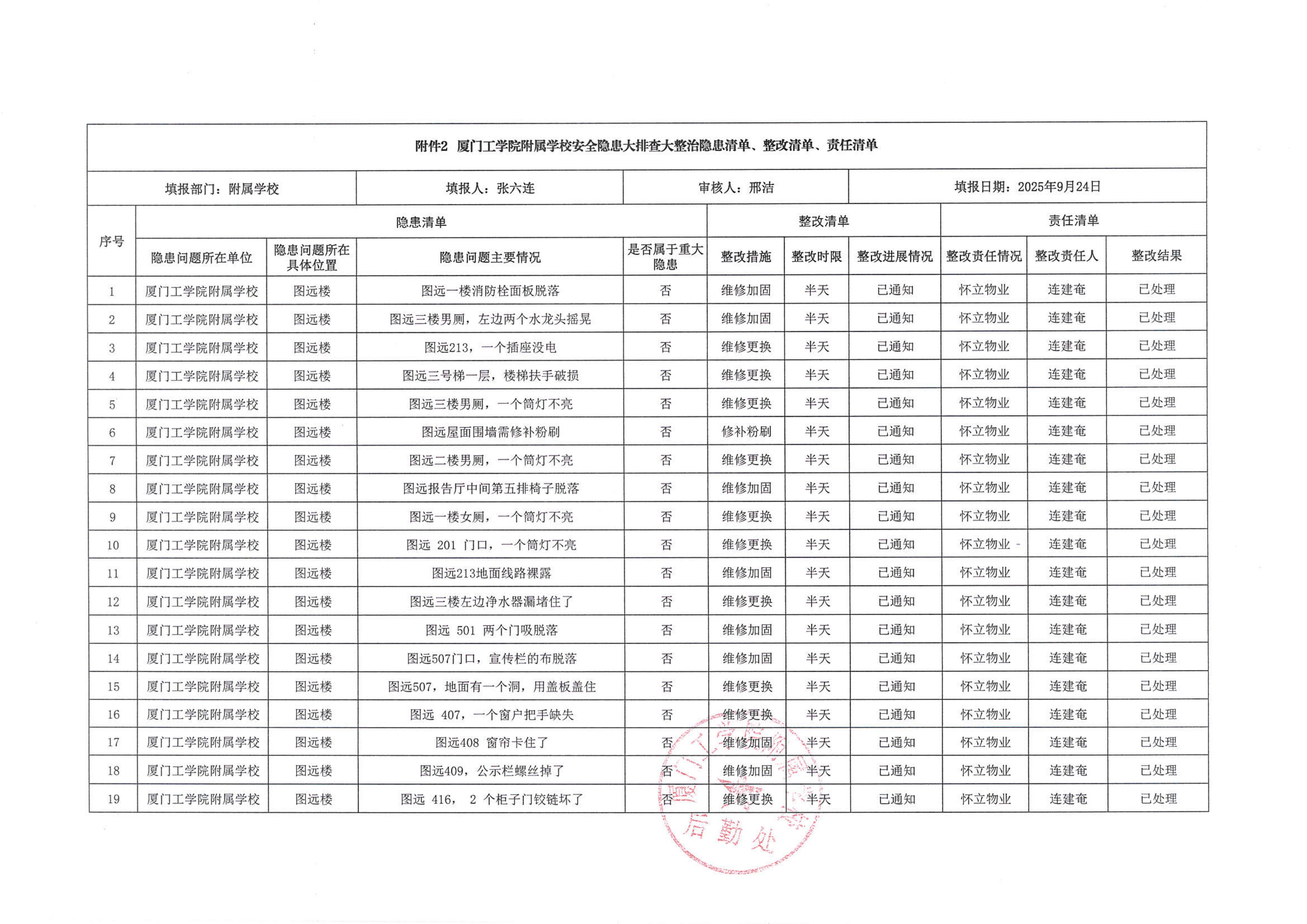 厦门工学院附属学校2025年9月份安全隐患大排查大整治隐患清单、整改清单、责任清单