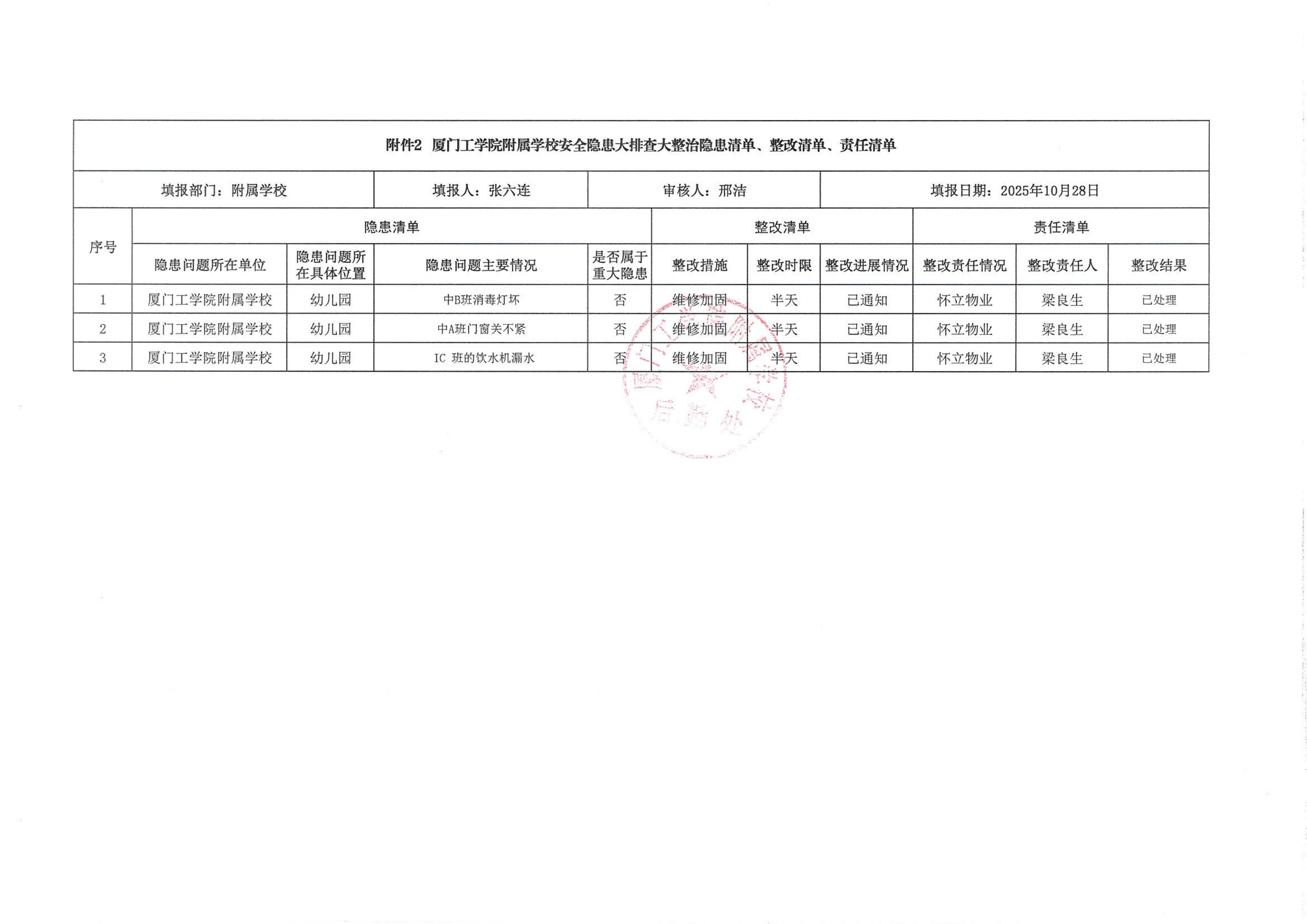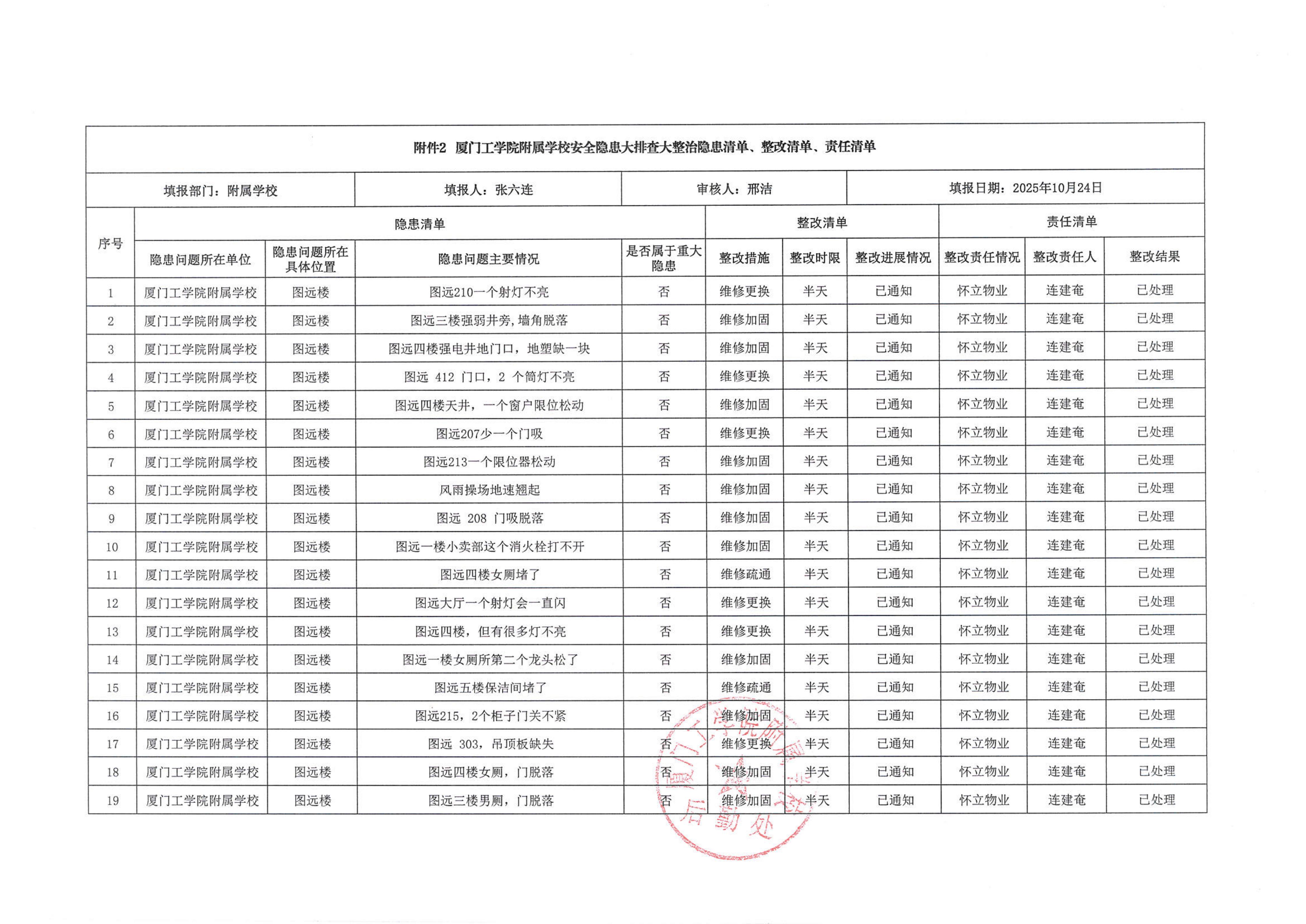 厦门工学院附属学校2025年10月份安全隐患大排查大整治隐患清单、整改清单、责任清单