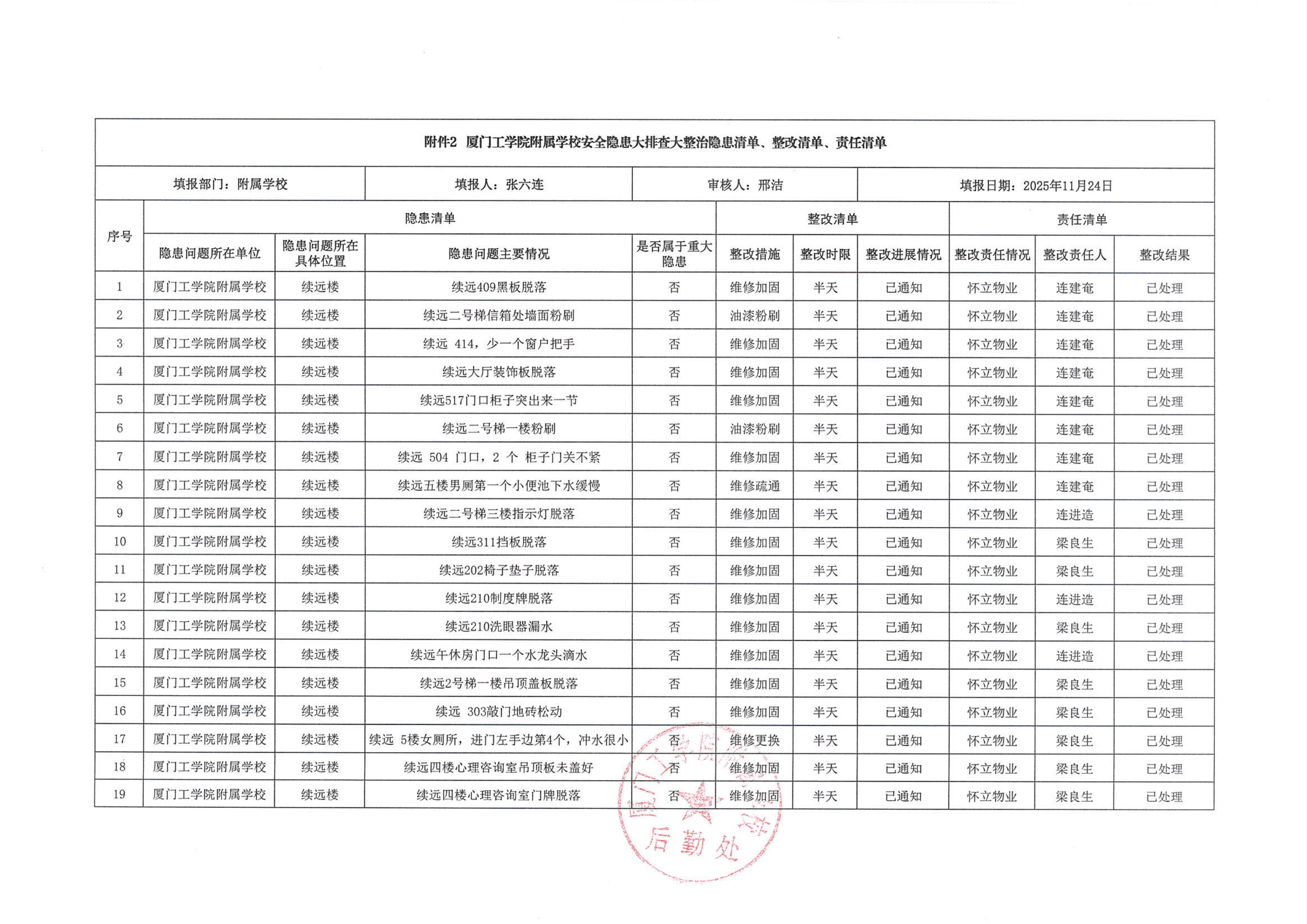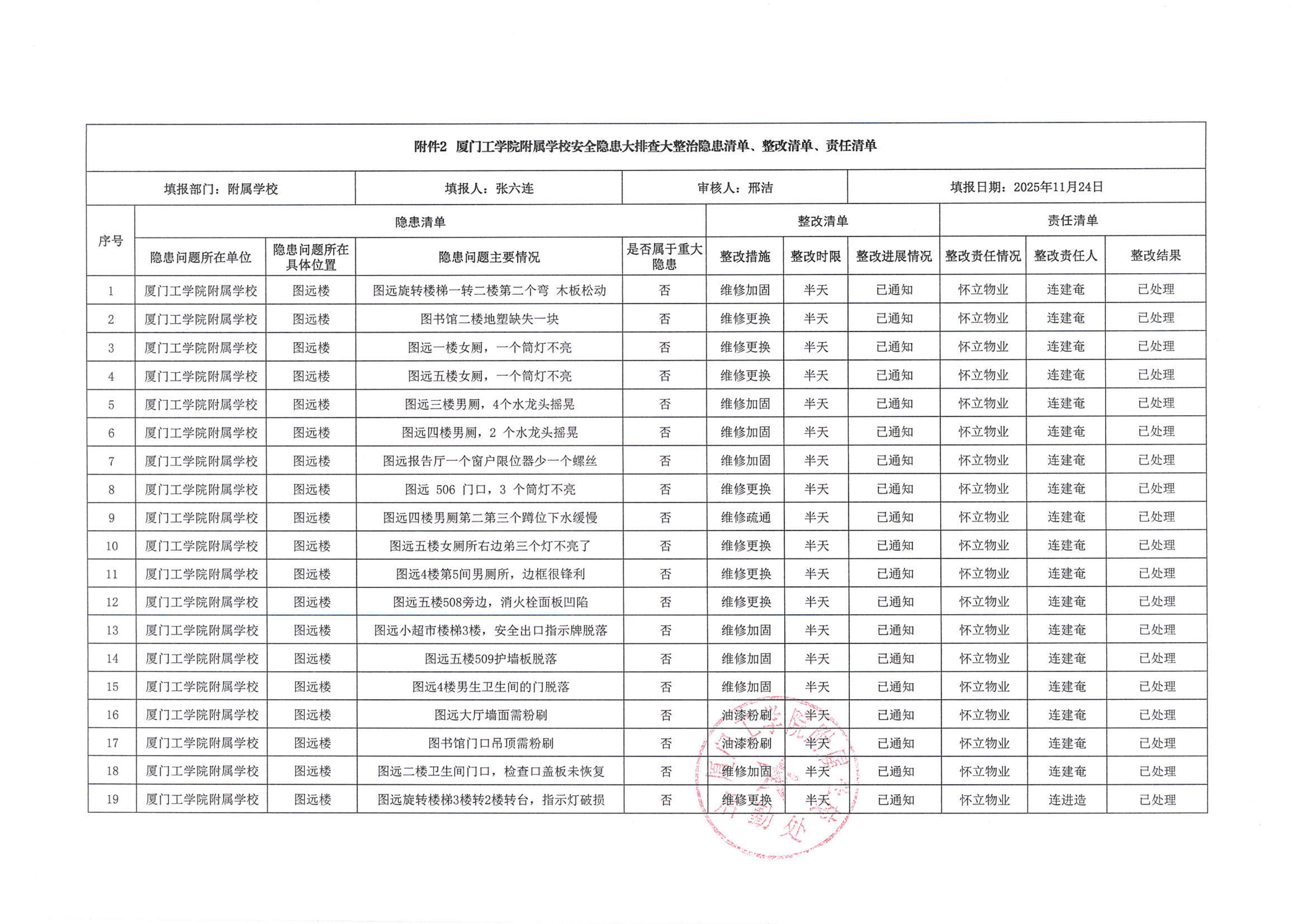 厦门工学院附属学校2025年11月份安全隐患大排查大整治隐患清单、整改清单、责任清单