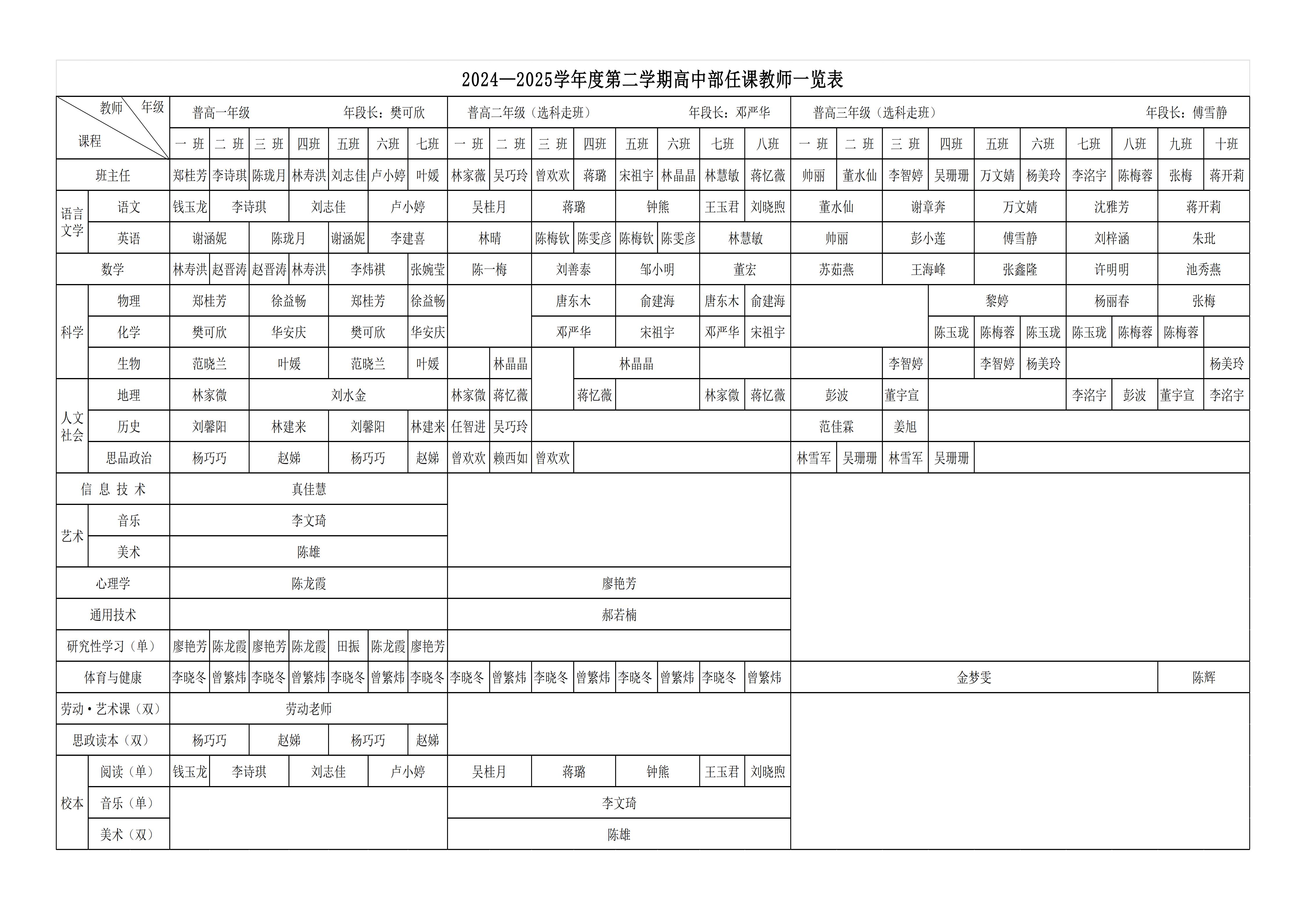 2024—2025学年度第二学期高中部任课教师一览表