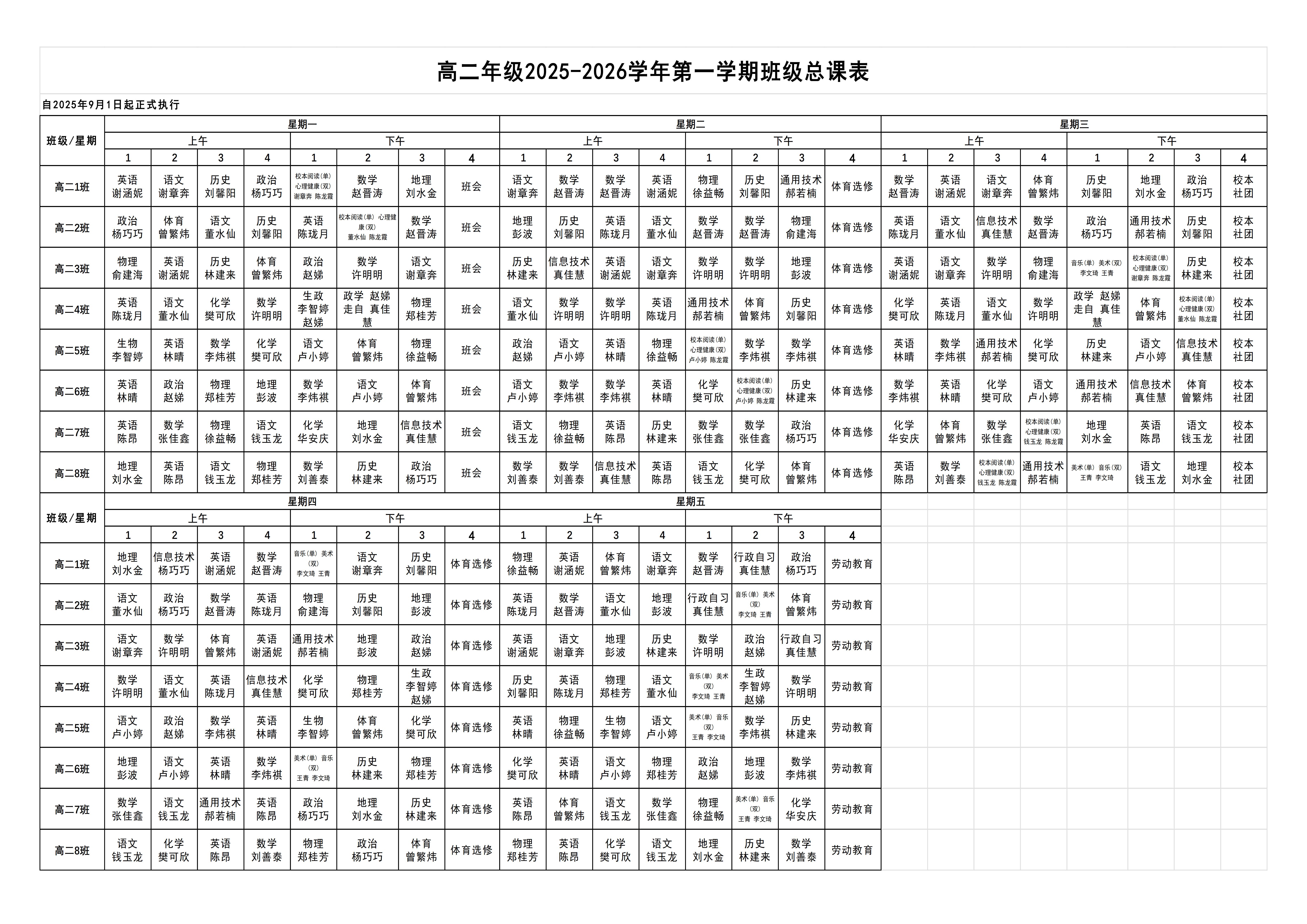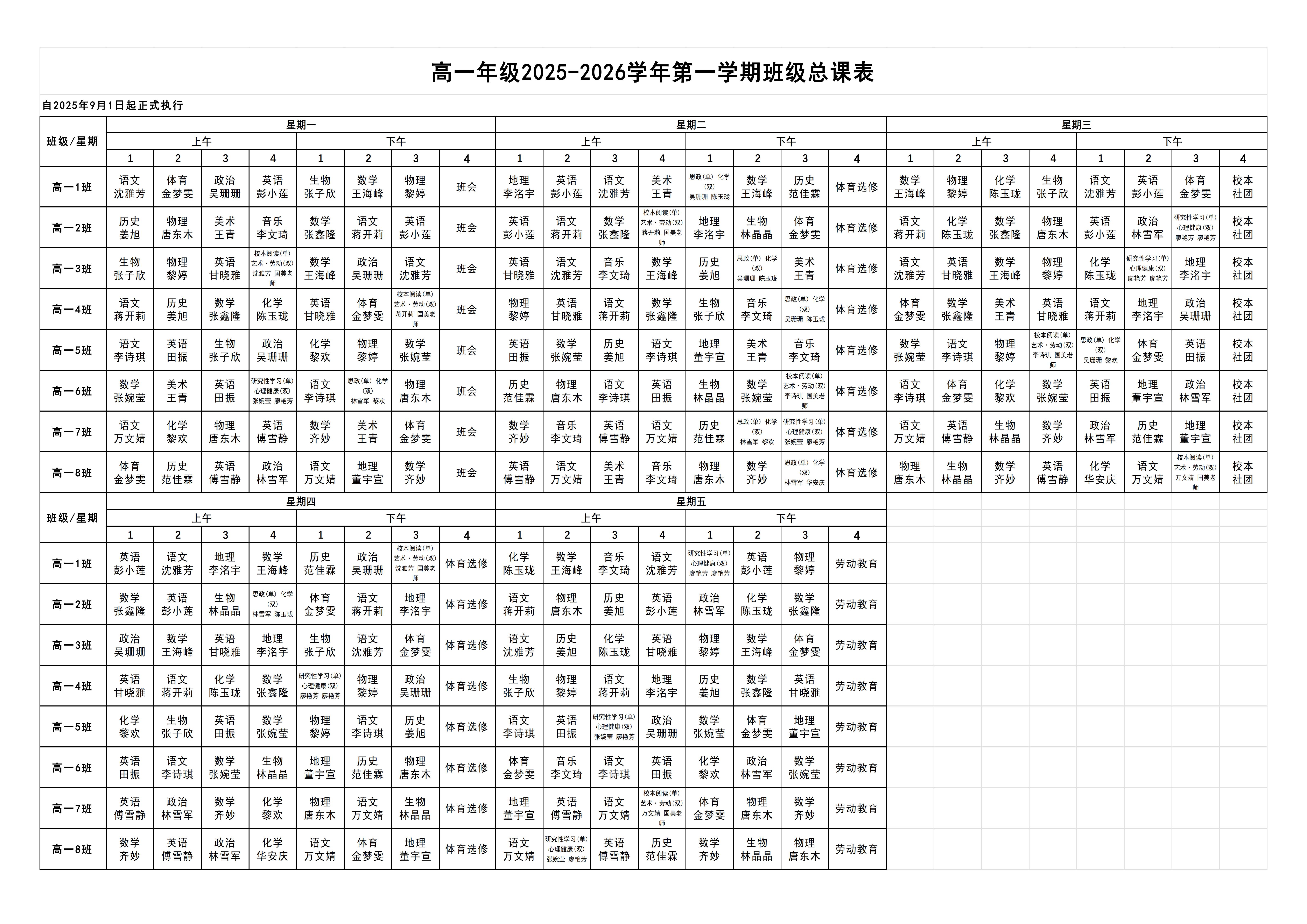 高中部2025-2026学年第一学期课程表