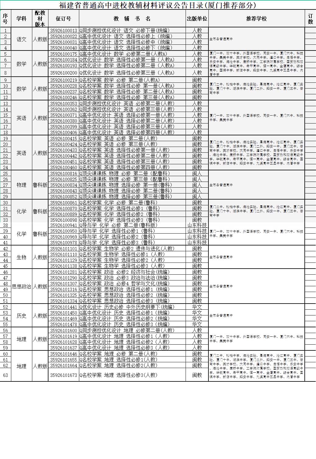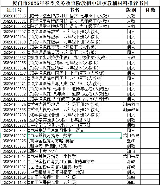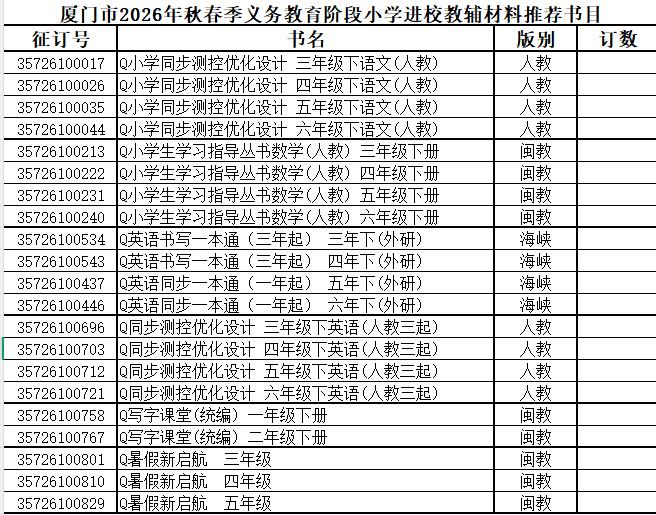 二、福建省、厦门市2026年春季进校教辅材料推荐书目公示(见附件)
