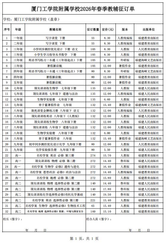 厦门工学院附属学校2026年春季进校教辅征订公示